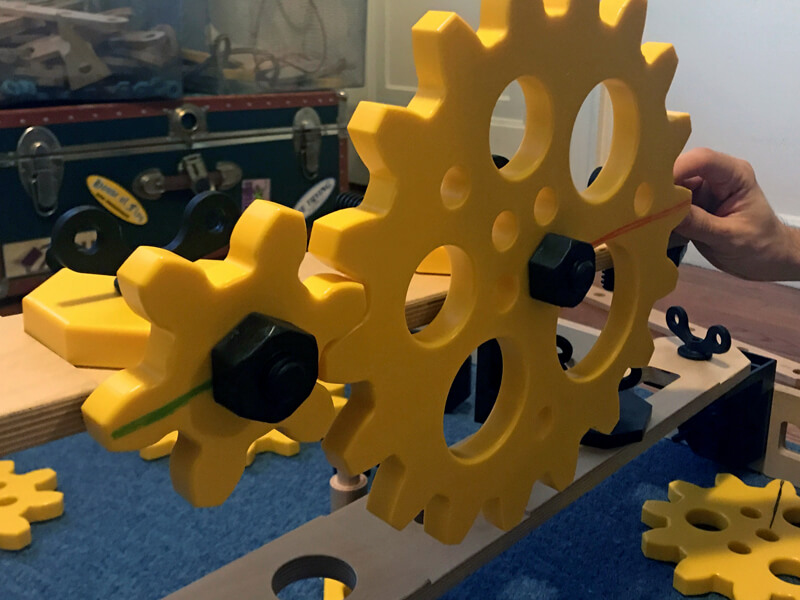 A good math extension would be to have students calculate the gear ratio of all the possible pairings of gears in the Simple Machines Add-On kit. Some of the gears can be meshed together using the standard 8” hole spacing on the Basic Builder Kit planks. With these, the students can count the number of rotations as one gear drives another.
